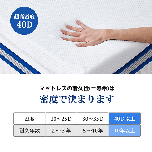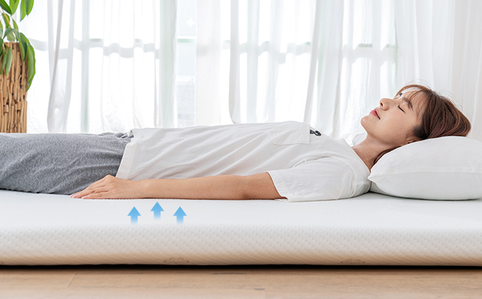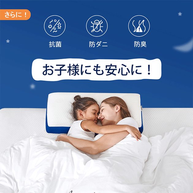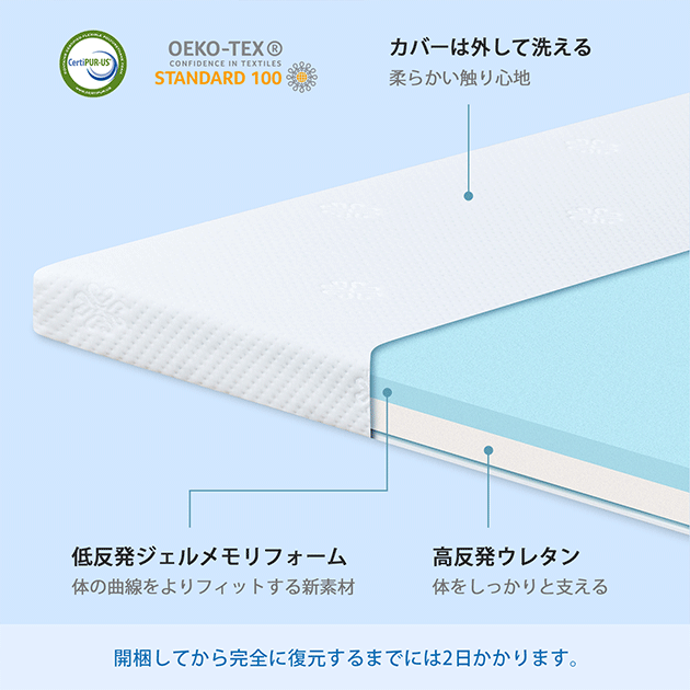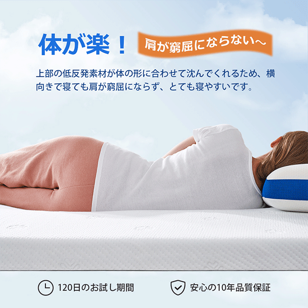 体が沈み込みすぎないように低反発素材の下に高 反発素材を使った2層構造のマットレス。 柔らかいけど反発力がある寝心地で、腰や肩周り がバランスよく支えられ、睡眠時にバランス良い 姿勢を保ってくれ、腰への負担を軽減し、より快 適で爽やかな眠りを実現します。